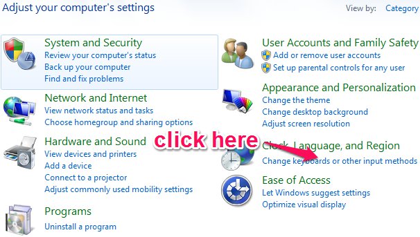 Go to Start menu. Click on Control Panel and you will see this screen. You want to click on Change keyboards or other input methods.