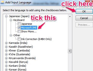 Scroll down and double-click on Japanese. Then double-click on Keyboard, select Microsoft IME (Input Method Editor), and then click OK.